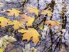 Fall reflection: Autumn at a glanceMaple leaves in puddle reflecting bare trees and sky in October, northern Illinois, USAKeywords:reflection, water, puddle, surface, autumn, fall, maple, leaves, wet, flat, golden, orange, red, blue, bare, trees, branches, fall color, nobody, rainwater, edges, group, October, Illinois, Midwest, horizontal